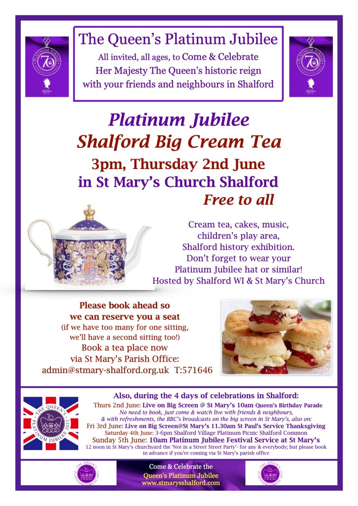 Platinum Jubilee celebrations begin…. Posted byParish of Shalford & PeasmarshJune 1, 2022June 1, 2022Posted inCommunity, Events, Worship Share this: Click to share on X (Opens in new window) X Click to share on Facebook (Opens in new window) Facebook Like Loading... Related Published by Parish of Shalford & Peasmarsh Warm, welcoming, active, inclusive, Church of England Anglican Parish in the Deanery and Diocese of Guildford, Surrey View more posts