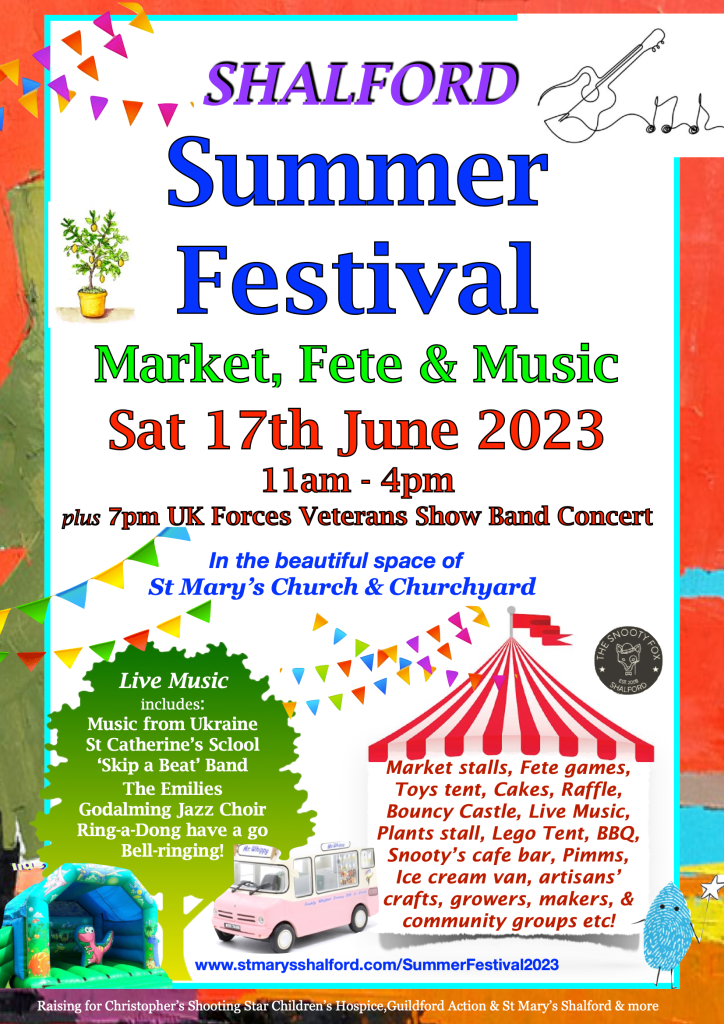 So next Shalford Summer Festival Market at St Mary’s will either be Summer 2024 or Summer 2026 (depending on availability of stalls & music – so do get in touch as soon as you can if you’re keen to be there)